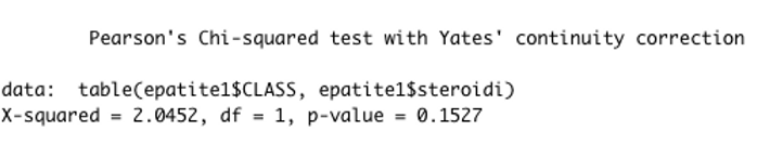 hisq.test(table(hepatitis1$CLASS, hepatitis1$steroids))
